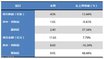 成交方面:新三板本周累计成交4.06亿股,合计成交17.65亿元,较上周增长7.79%。日均成交股票个数为634只,占总挂牌企业数量的5.45%。其中,创新层累计成交1.65亿股,成交金额达8.60亿元,较上周减少16.34%;基础层累计成交2.40亿股,成交金额达9.05亿元,较上周增长48.48%。