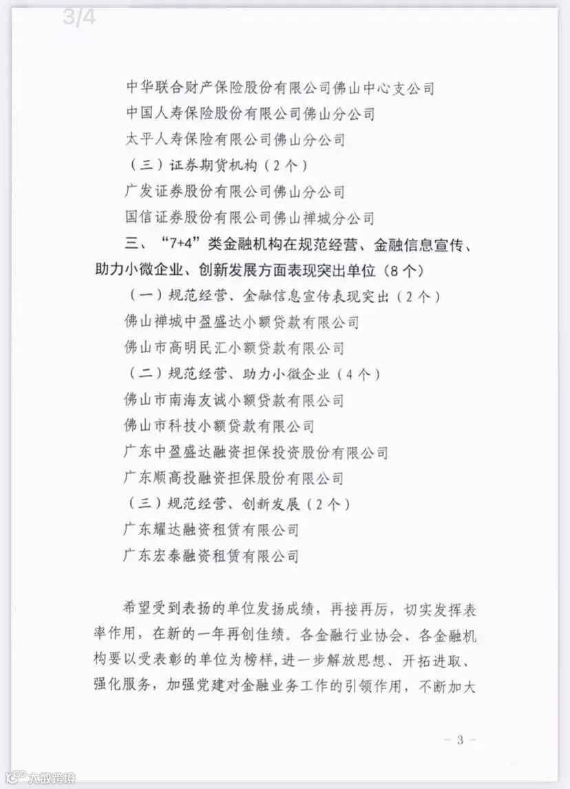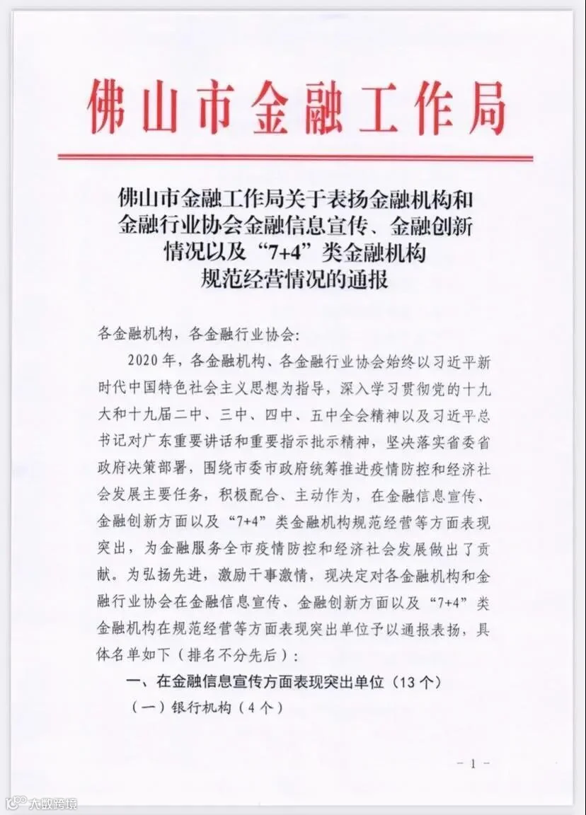 近日,佛山市金融工作局下发了《关于表扬金融机构和金融行业协会金融信息宣传、金融创新情况以及“7+4”类金融机构规范经营情况的通报》,广东中盈盛达融资担保投资股份有限公司获评“规范经营、助力小微企业”表现突出单位,佛山禅城中盈盛达小额贷款有限公司获评“规范经营、金融信息宣传”表现突出单位。