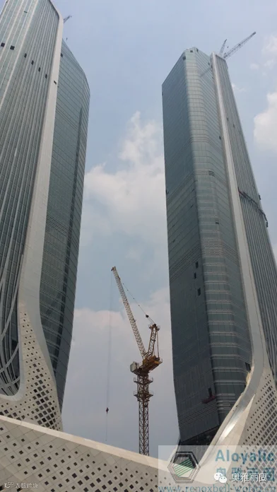 建造材料——阳极氧化蜂窝板。双塔楼外幕墙分割成10000件蜂窝板,其中扭曲板约2500件,需要制作扭曲板模具高达700个,加工难度高,生产任务重。