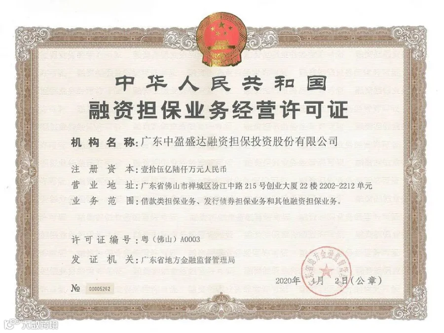 近日,根据《融资担保公司监督管理条例》(国务院令第683号)及《融资担保业务经营许可证管理办法》(银保监发〔2018〕1号)等相关规定,广东中盈盛达融资担担保投资股份有限公司(以下简称“中盈盛达担保”)的各项经营指标均符合行业监管要求,成功获得广东省地方金融监督管理局批准换发的融资担保业务经营许可证。