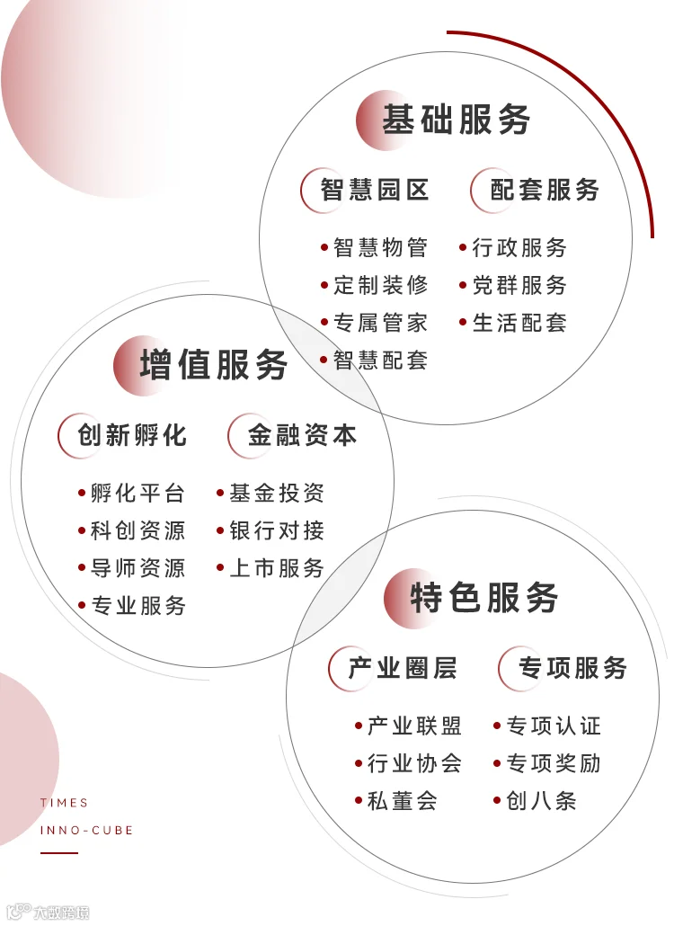 秉承“开放、链接、共享”的理念,时代创立方打造了“一个中心,两大支撑,三类服务”的产业服务体系,满足企业不同成长阶段的需求。