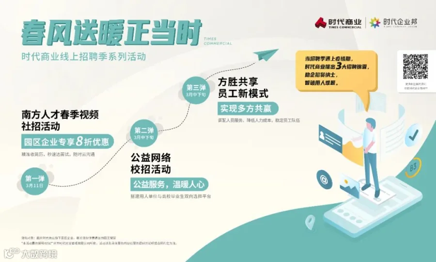 针对疫情期间中小企业线下招聘难的问题,时代商业搭建园区企业公益招聘平台,对接广州市人社局、天河区劳动就业管理中心、天河区人才港、南方人才等权威机构,为23家企业提供公益招聘和线上招聘服务,共对接200余个招聘者参与园区企业线上招聘。