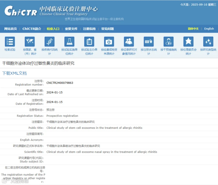 2024年,常州市第三人民医院开展了一项研究,旨在评估干细胞外泌体喷鼻治疗对常规抗过敏药物无效或疗效不佳的过敏性鼻炎患者的有效性与安全性。据报道,团队已完成10例患者的预试验。结果显示,所有受试者均未出现如传统激素疗法常见的鼻腔出血、感染或黏膜萎缩等不良反应,鼻黏膜活检未发现组织损伤,初步证实了间充质干细胞外泌体具有良好的生物相容性。