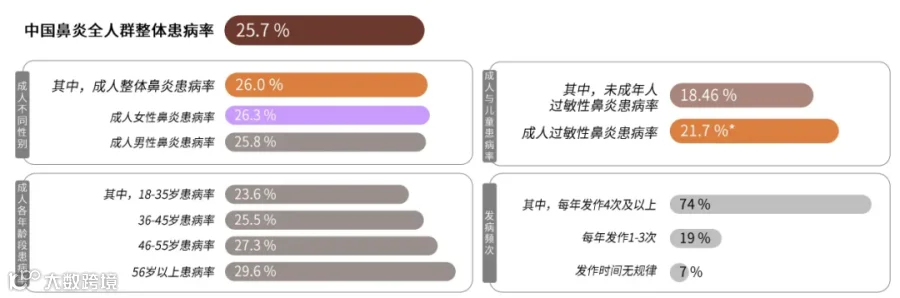 数据来源:中华医学会耳鼻咽喉头颈外科学分会鼻科学组、中华预防医学杂志、PubMed、中康CMH及公开资料,博观研究院整理。注:成人过敏性鼻炎患病率为估算值。