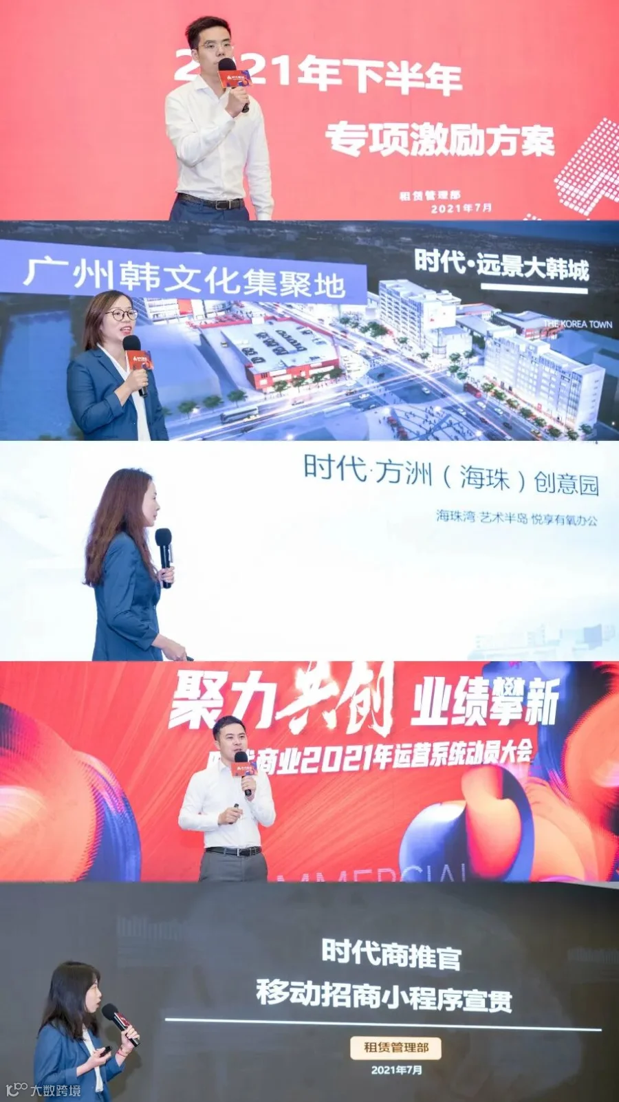 7月30日,时代商业在E-PARK(番禺)E会中心召开了以“聚力共创,业绩攀新”为主题的2021年下半年运营系统动员大会。时代商业总经理张建华、副总经理敖诚韬、人力行政管理部总监赵柳柳、品牌推广部总监张旻彦及各项目运营系统领导、同事共100余人出席了本次大会。大会环节包括业绩解读、优秀项目及个人颁奖、优秀项目及运营代表经验分享、项目誓师、项目推介、专项激励及移动招商工具宣贯等。