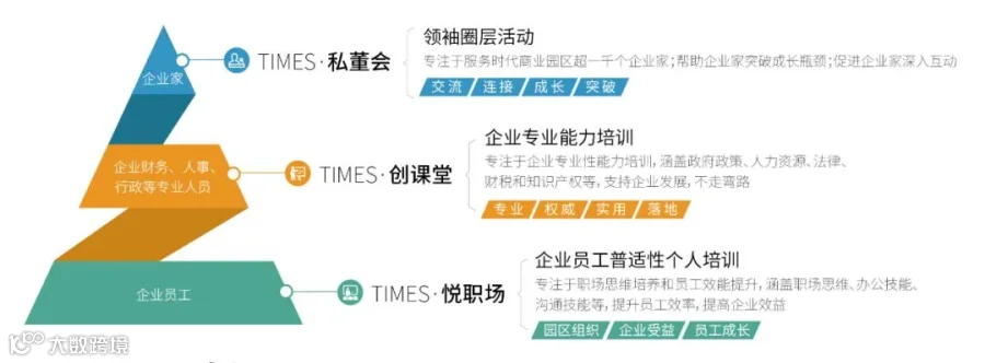 一直以来,时代商业在满足企业基本物业需求的同时,重点致力为企业提供各类增值服务支持,并搭建金字塔活动模型,严选专业机构,分别针对企业员工、管理层和企业主,组织开展员工普适性技能培训、专业性能力培训和领袖圈层活动,为多领域企业提供全周期服务,陪伴企业不断成长。