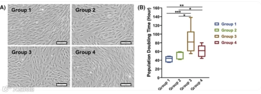 健康组(第1组)和2型糖尿病患者的自体骨髓来源间充质干细胞(BM-MSCs)的表征对比(糖尿病持续时间:第2组:<5年,组3:5-10年,第4组:>10年)