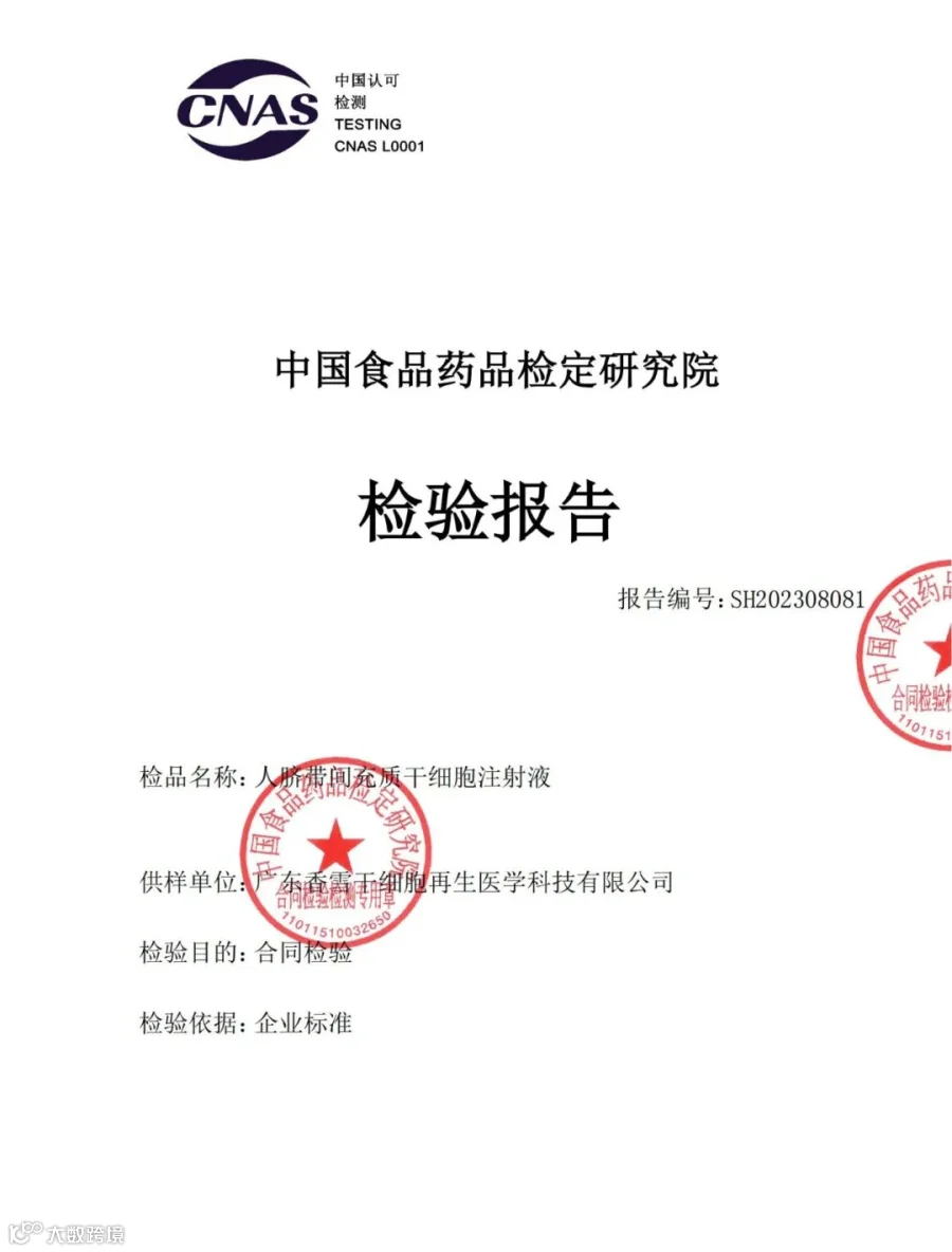 广东香雪干细胞再生医学科技有限公司作为第二批获得中国食品药品检定研究院细胞报告及第一批获得中国食品药品检定研究院细胞制剂报告的企业,深耕细胞行业,引领细胞质量。取得中检院的细胞质量检验报告,标志着该企业从细胞制剂的生产工艺到质量控制体系,均符合药品申报的前提,具备生产临床级干细胞制剂的能力。同时国家的认证,让整个行业正向着规范化、更加长远地利于临床转化的方向发展。