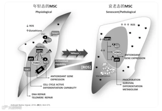 年轻态的干细胞胞体饱满、呈明显的梭形;衰老的干细胞胞体宽大扁平