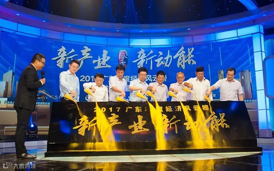 活动上,随着领导嘉宾手持容器把金沙缓缓撒向启动台,“新产业 · 新动能”六个金色大字随即亮出,标志着2017广东年度经济风云榜正式启动。