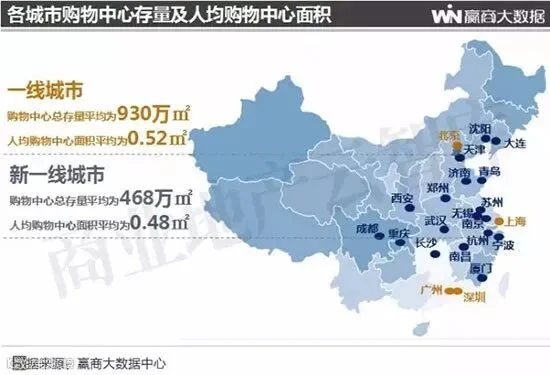 数据显示,新一线城市购物中心总存量平均为468万㎡,人均购物中心面积为0.48㎡,人均购物中心水平已达一线城市水平。