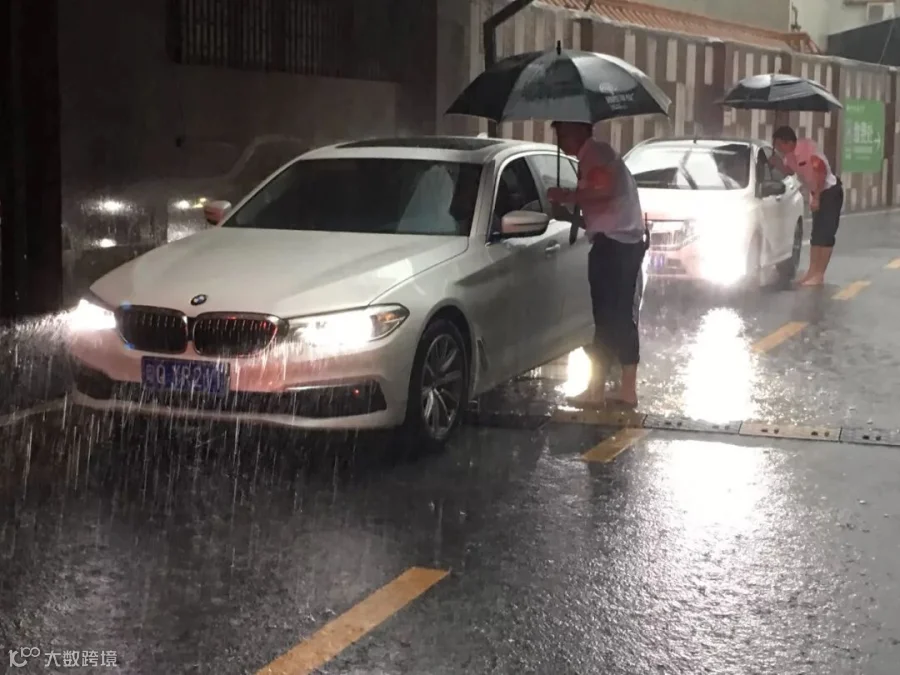 在暴雨中疏导车辆进出