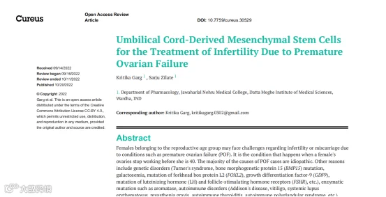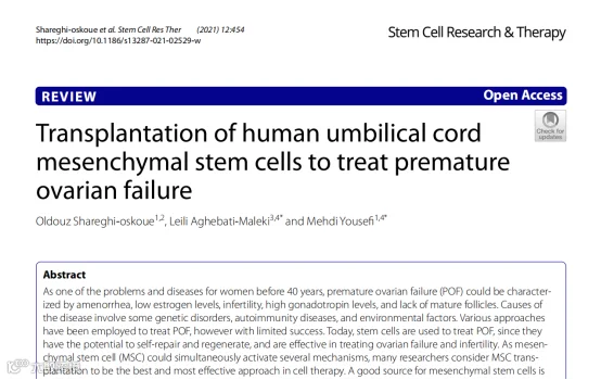 1、Shareghi-Oskoue O, Aghebati-Maleki L, Yousefi M: Transplantation of human umbilical cord mesenchymalstem cells to treat premature ovarian failure. Stem Cell Res Ther. 2021, 12:454. 10.1186/s13287-021-02529-W