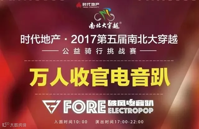 2017年11月6日,时代地产·2017第五届南北大穿越公益骑行挑战赛“The Fore破风电音趴”将在广州长隆水上乐园盛大举行。这是南北大穿越为挑战成功的骑士们举办的、万人规模的超大型庆功会,也是骑行与电音两大流行文化首次碰撞出的耀眼火花。