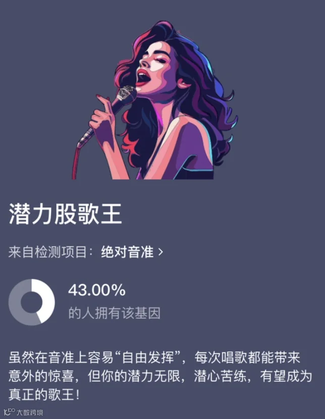 你的耳朵能精准捕捉每个音符吗? 或者你是KTV里的“气氛大师”? 快去基因宝app首页「亮点基因」 查看你的「绝对音准」卡片 探索你的独特基因~ 以上就是基因宝上新播报 记得关注「基因宝」公众号 及时获取最新内容动态哦~ 想要了解更多? 快去基因宝APP查看吧!