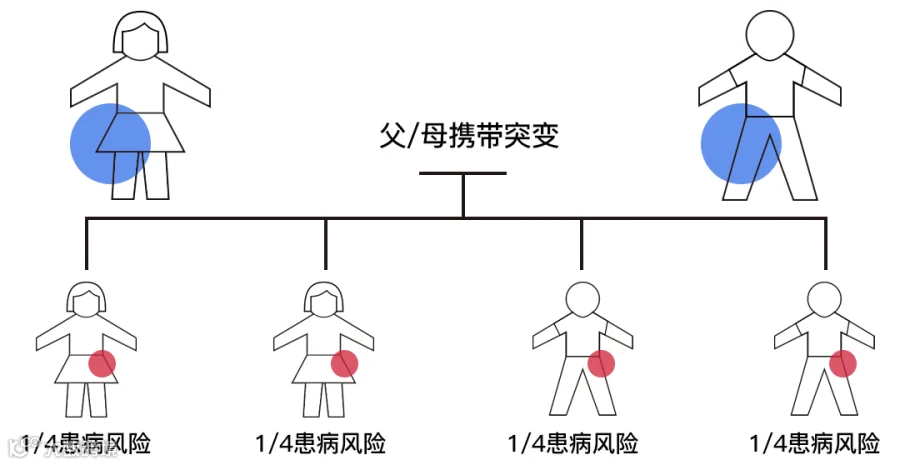 ,有 50% 的精子或卵子携带了突变,每一胎就有 1/4 的患病风险。