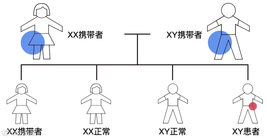 第三种是「伴性遗传」,携带者母亲的两条 X 染色体中有一条存在致病的突变,