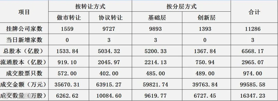 新三板挂牌总数达到11286家,其中做市转让1559家,协议转让为9727家。按照分层方式,基础层9893家,创新层1393家。