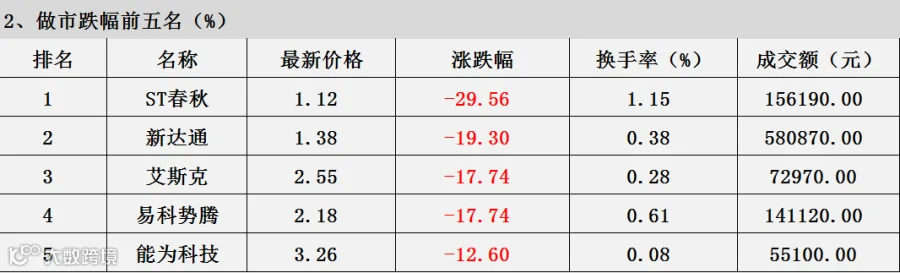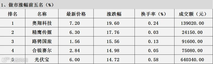 从上述表中可知:做市涨幅排在第一的奥翔科技,涨幅达到19.60%,观上一个交易日数据可知,奥翔科技已连续两日涨幅排在前五。