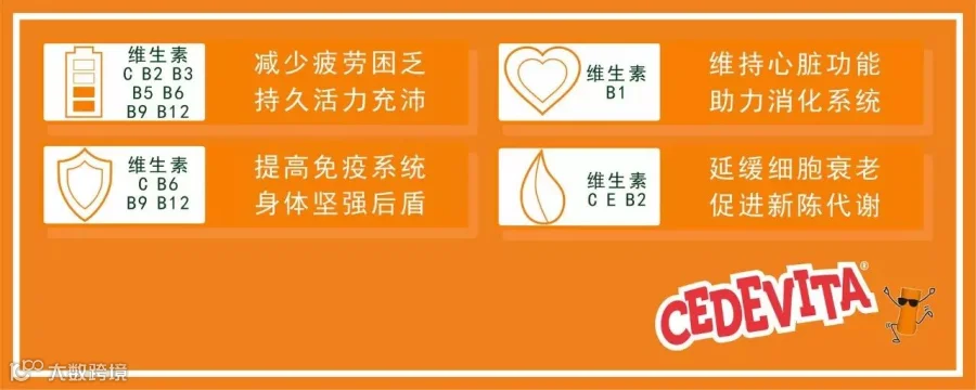 完美的9种维生素配方提供我们每日所需。Cedevita(鲜地唯他)的维生素,并非我们常见的维生素C或者维生素功能饮料,而是根据最新的人体科学研究成果,按照人体每日所需配比而成的9种维生素配方,好比配方奶粉,科学而精确。