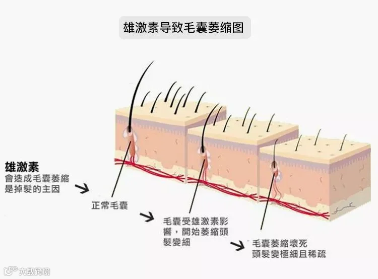 无论是男性还是女性,体内都同时存在雄性激素和雌性激素。雄性激素令男孩们在青春期发育时长出毛、喉结,但过多的雄激素分泌或者过度活跃的雄激素受体则使体内二氢睾酮含量增加,作用在头发上,就表现为头发毛囊过早成熟、头发生长周期缩短,使头发提前停止生长,然后脱落。于是,头发就越来越细,越来越软,最后“寸草不生”。