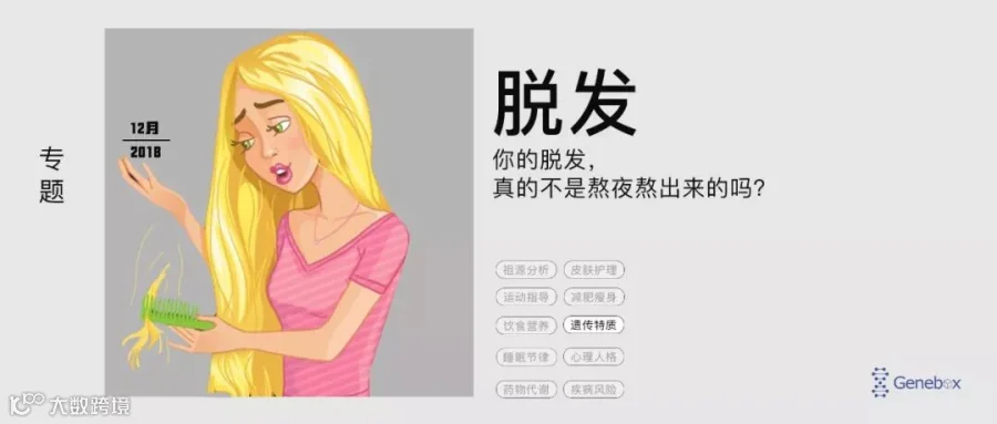 当然除了通过本文了解生活方式可能带来的脱发风险,你还可以选择来Genebox,了解写在你身体说明书中关于脱发的秘密,科学预防脱发,让你不再为日益稀疏的头发感到担忧。