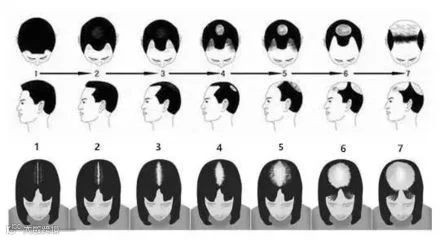 浙江大学第一医院皮肤科在2010年-2011年期间一共收治了460多例脱发患者,其中很多都是20-30岁期间就开始脱发的,并且已经发展到了下图的2/3级。这些人中,46%的人有脱发的家族史,但工作学习压力大、过度辛辣油腻饮食和睡眠质量差也与脱发的严重程度正相关。