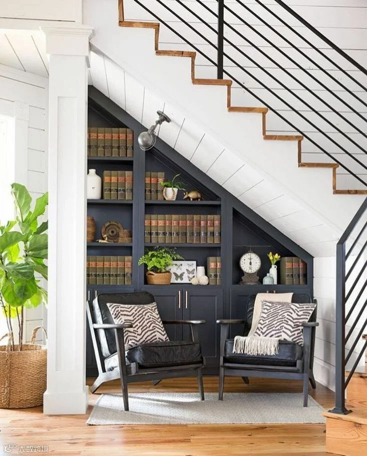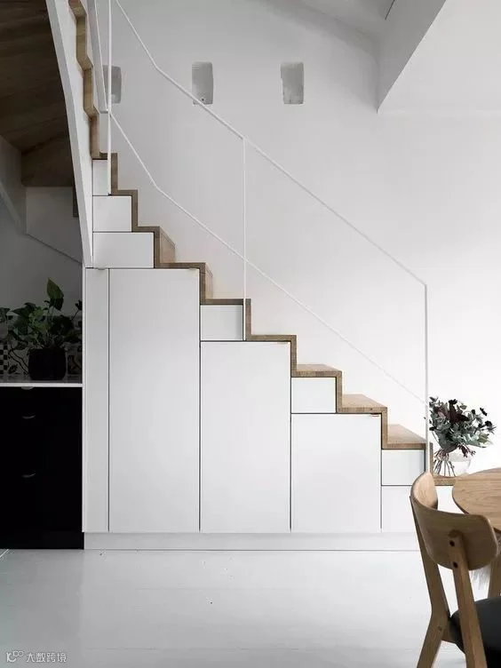 木质踏步的楼梯,更易于与下方的空间的物品相融,不仅可以设置储藏柜和置物架,也可以设置成为功能区,更好的将这个空间利用起来。