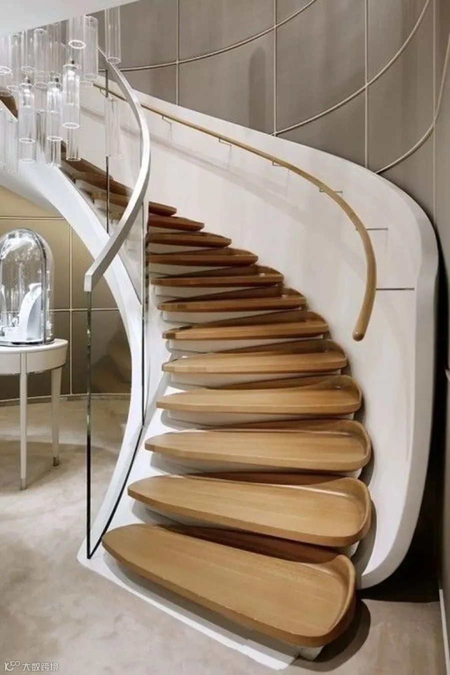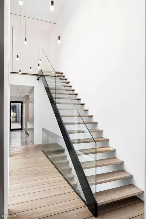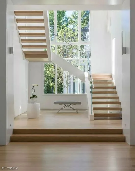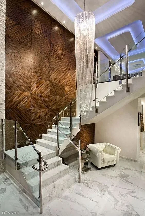 玻璃扶手和木质踏步的搭配,这组轻奢而又简约时尚,如果楼梯使用玻璃质感的踏步,整体通透,光彩绚丽。