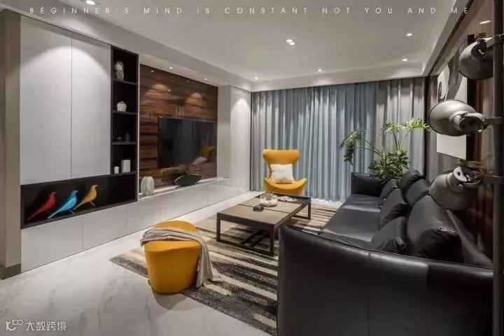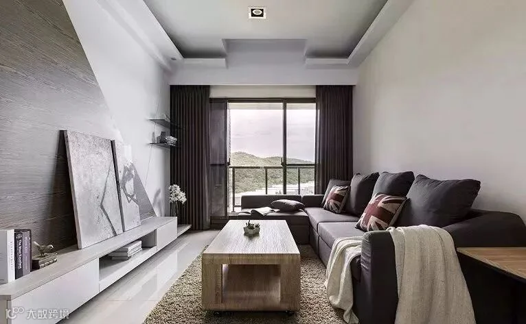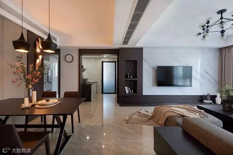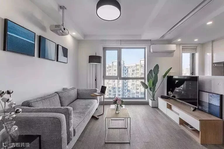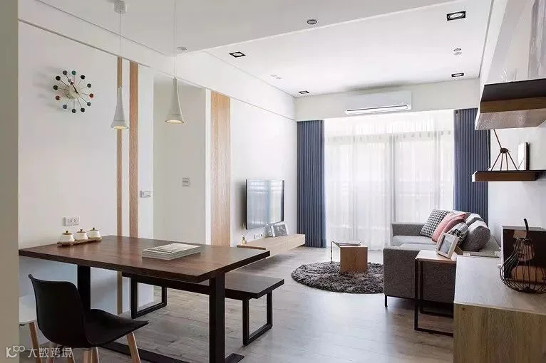 小户型的电视背景墙可以带有一些收纳,然后空间不要完全的隔断开,有一定的连通性,这样非常的实用,又能够扩展空间视觉感。