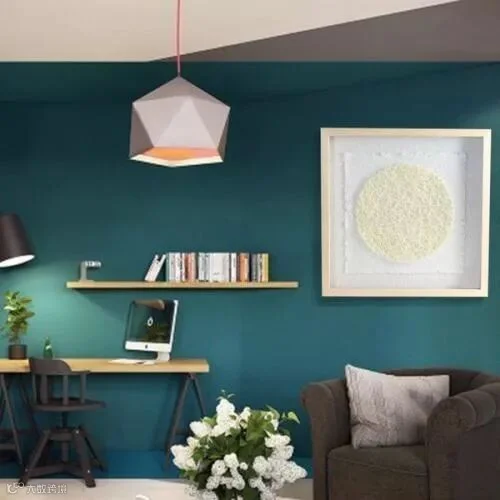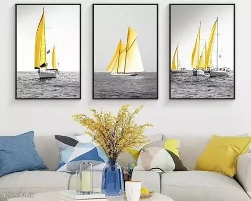 但是我们可以通过选择和装饰画同色系的沙发抱枕、台灯或是窗帘来呼应,使其不突兀。具体可以参考下图的三连接线。