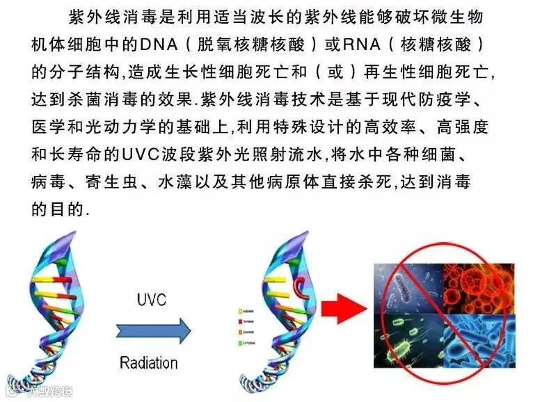紫外线主要是通过对微生物(细菌、病毒、芽孢等病原体) 的辐射损伤和破坏核酸的功能使微生物致死,从而达到消毒的目的,其中波长265nm的紫外线杀菌消毒效果最佳。