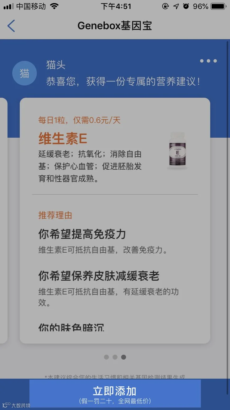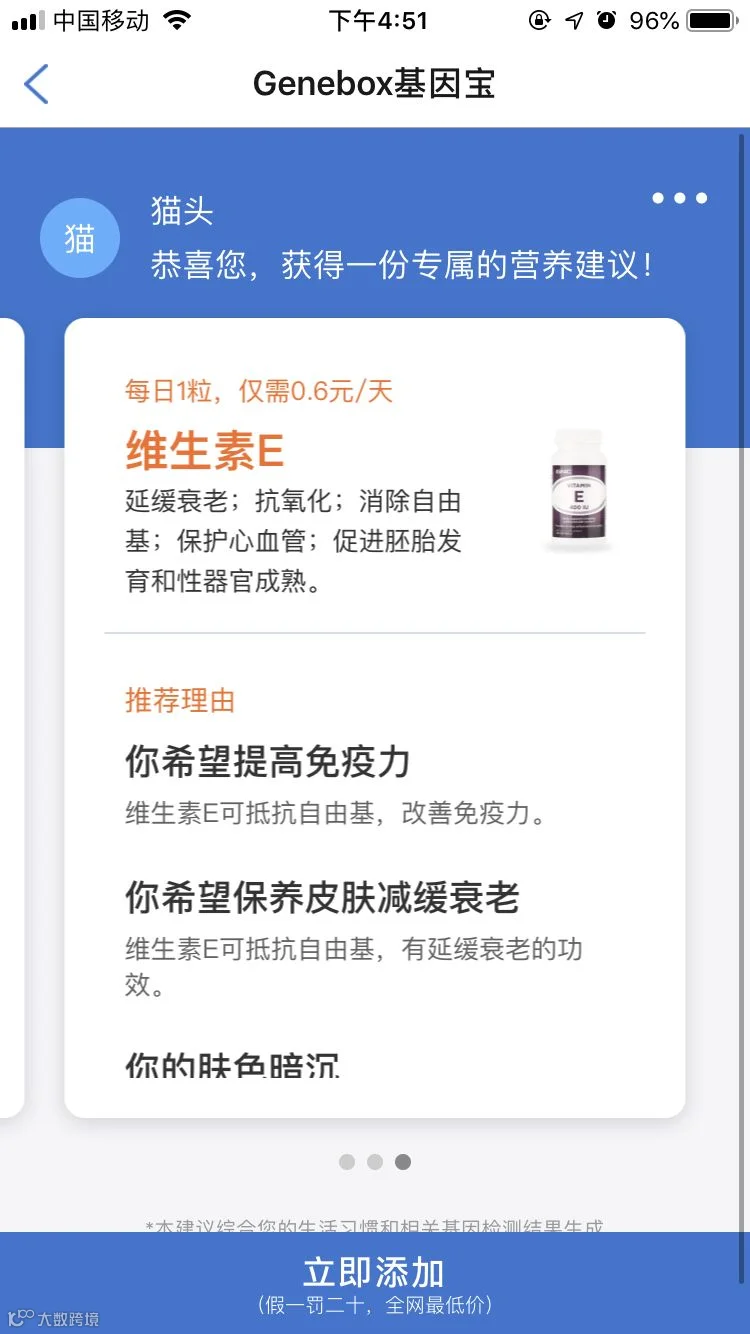 而且基因宝还特别贴心地帮我算出了每天需要补充各种营养素所需的价钱。例如维生素E,OMG!没想到每天只需0.6元,我就可以轻松提高免疫力和皮肤抗老化能力了耶~简直不要太值!