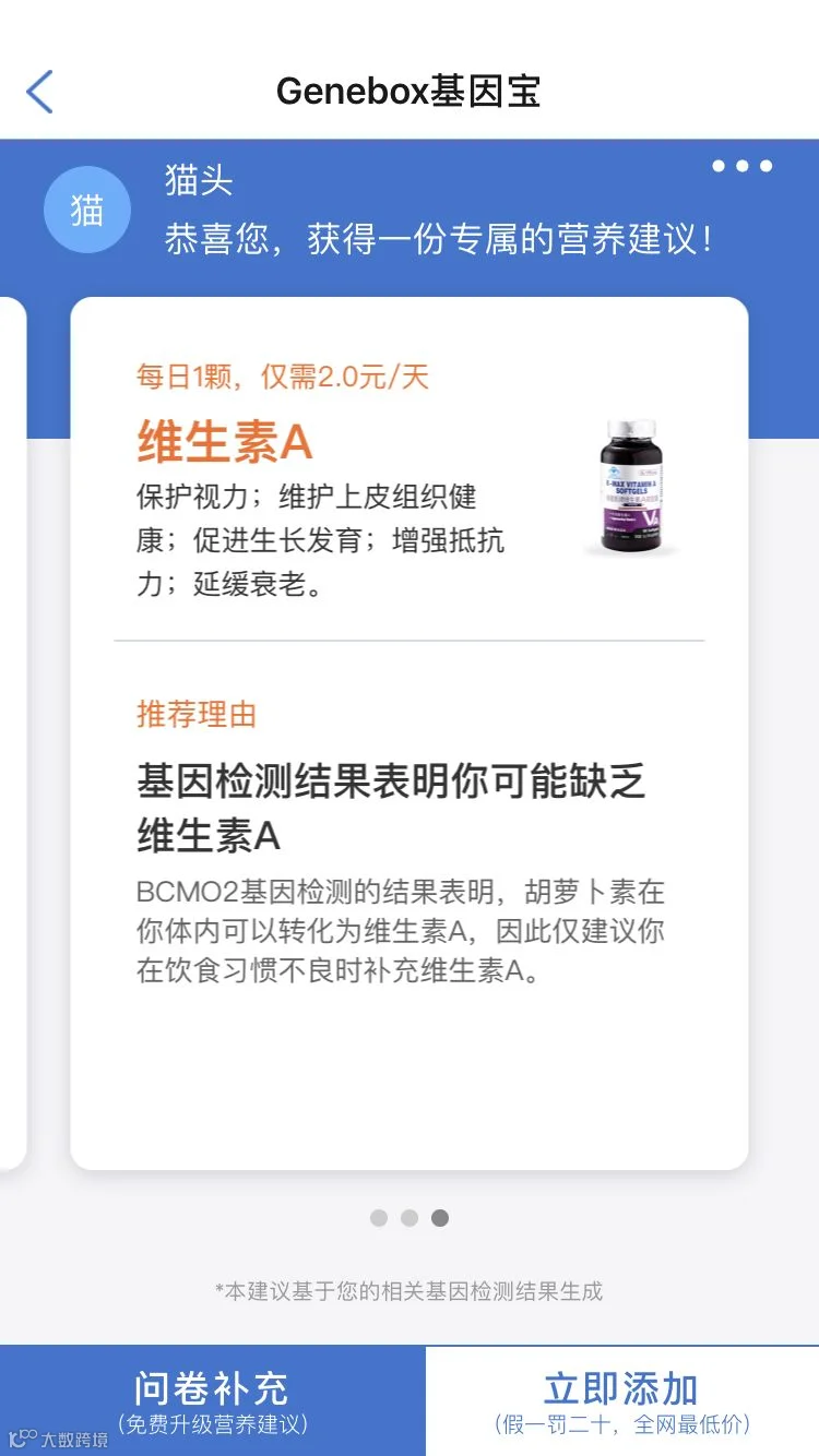 A1:根据你的基因检测结果,和一份专业的营养问卷,为你生成一份精准定制的个性化膳食补充方案。
