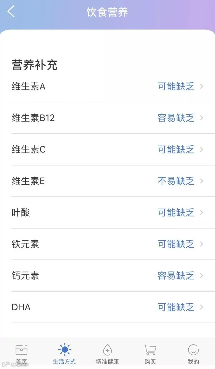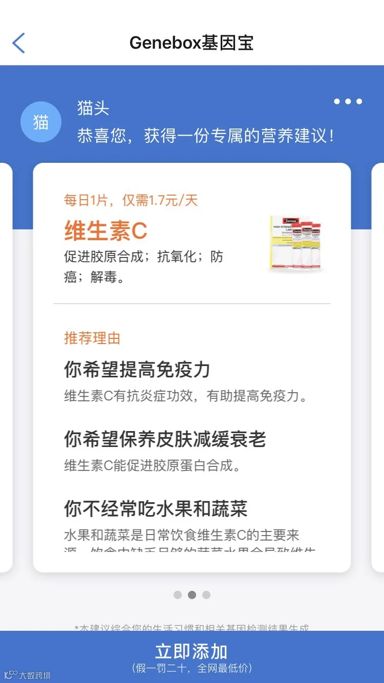 凡是已购买了「生活方式」检测的用户,可以免费使用「个性化膳食补充方案」功能,将基因宝APP更新至最新版本(v2.0.1),点击首页的精准营养按钮即可~