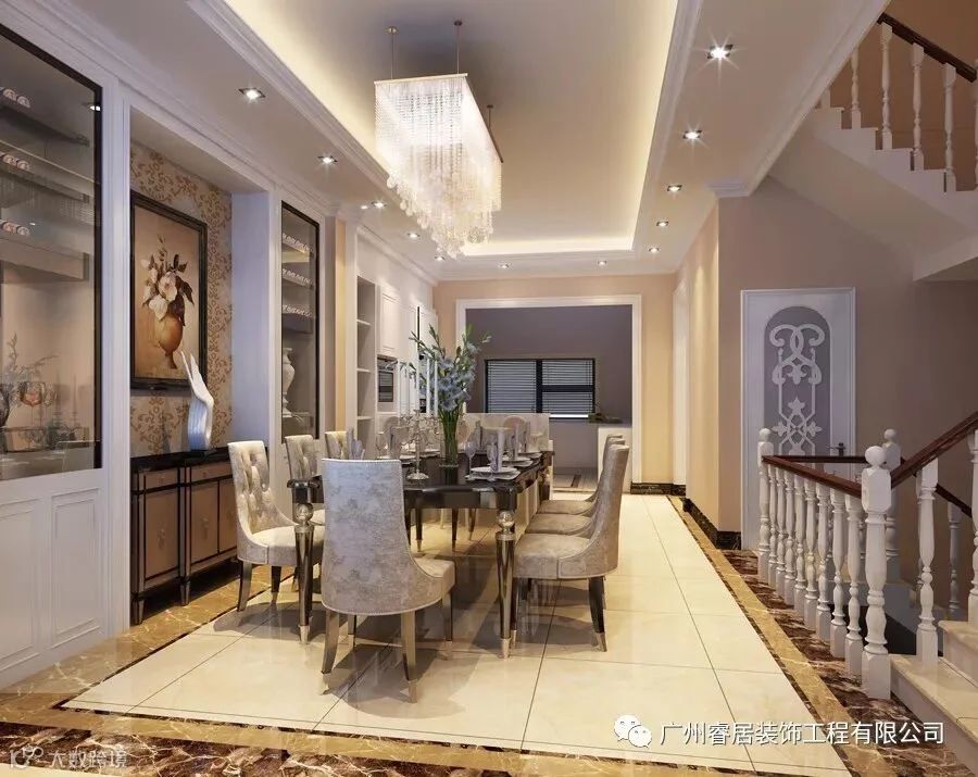 6.2米高空挑高进入眼帘,施华洛斯奇的水晶吊灯结合现代线条的天花造型照映整个空间奢华感,我们跳出了隆重的色彩,采用了空间通透明亮,色彩品分柔和的材料来设计,为了更能呼应整个空间的风格设计,无论是门厅,客厅餐厅还是卧室等等,都采用了点线面的设计组合斱式,即体现了现代的味道更不失简欧风格,用精品的艺术品营造出高雅的艺术氛围,同时地面石材以暖色调为主以少量的黑色、金色石材分割地面拼花,包括卧室地面用金属木地板以人字拼的手法拼接活跃整个空间气氛。