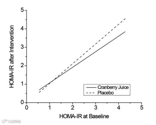 图2:饮用蔓越莓汁或安慰剂前后的胰岛素阻抗性变化