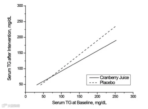 健康成年人连续8周分别饮用蔓越莓汁与安慰剂后,蔓越莓汁组受试者的血清三酸甘油酯浓度下降幅度显著大于安慰剂组(图3)。