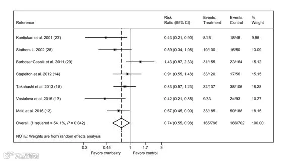 荟萃分析研究表明,接受蔓越莓治疗的健康女性的泌尿道感染复发风险比未接受蔓越莓治疗的健康女性低26%(图1)。因此蔓越莓可以作为一种有效的非药物方法来预防一般健康女性泌尿道感染复发 [2]。
