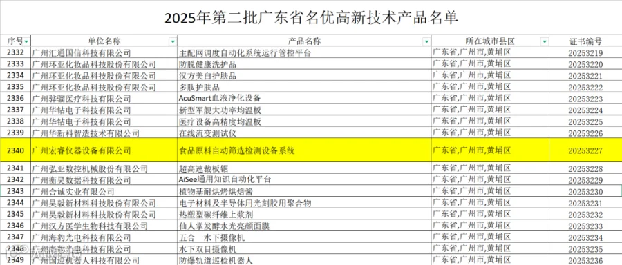 近日,广州宏睿仪器设备有限公司自主研发的 「食品原料自动筛选检测设备系统」 ,凭借其领先的技术创新性与卓越的产品性能,成功通过权威评审,荣获 “广东省名优高新技术产品” 认证!