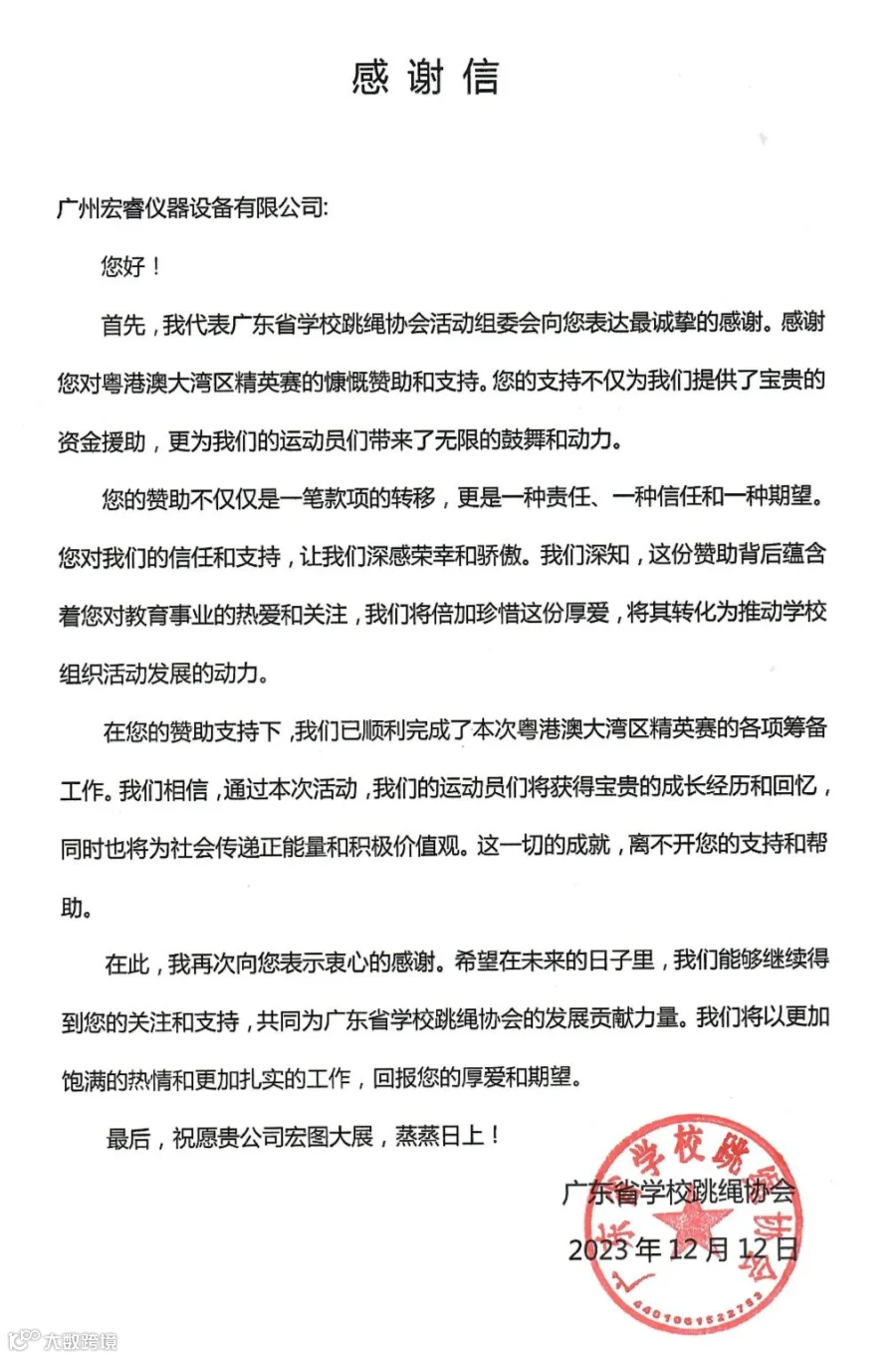 我司长期以来一直热心公益,积极赞助体育事业。近期,我司赞助的粤港澳大湾区学校跳绳比赛也收到广东省学校跳绳协会颁发的战略合作伙伴牌匾和感谢信,对我司的公益行为给予了积极肯定。未来我司仍将一如既往秉承初心,继续践行公益理念,回馈社会。