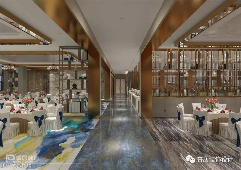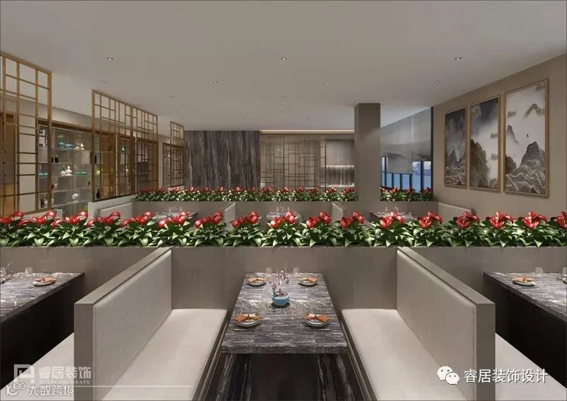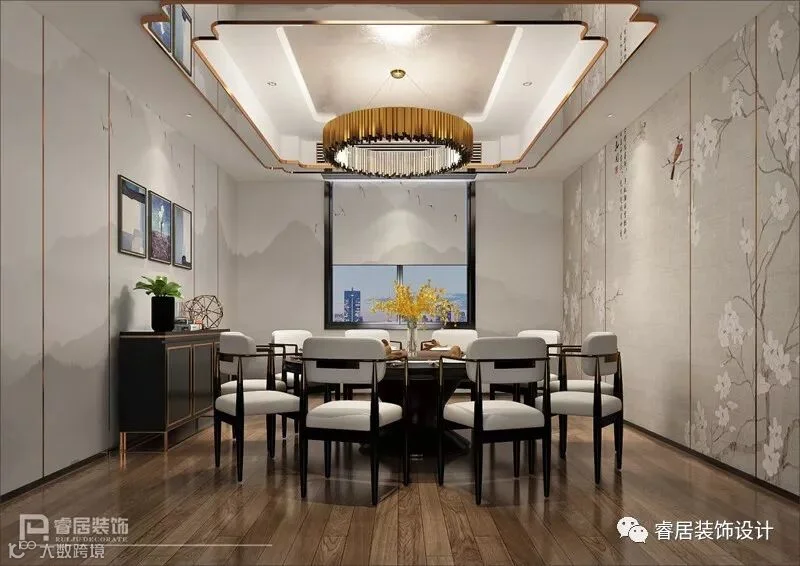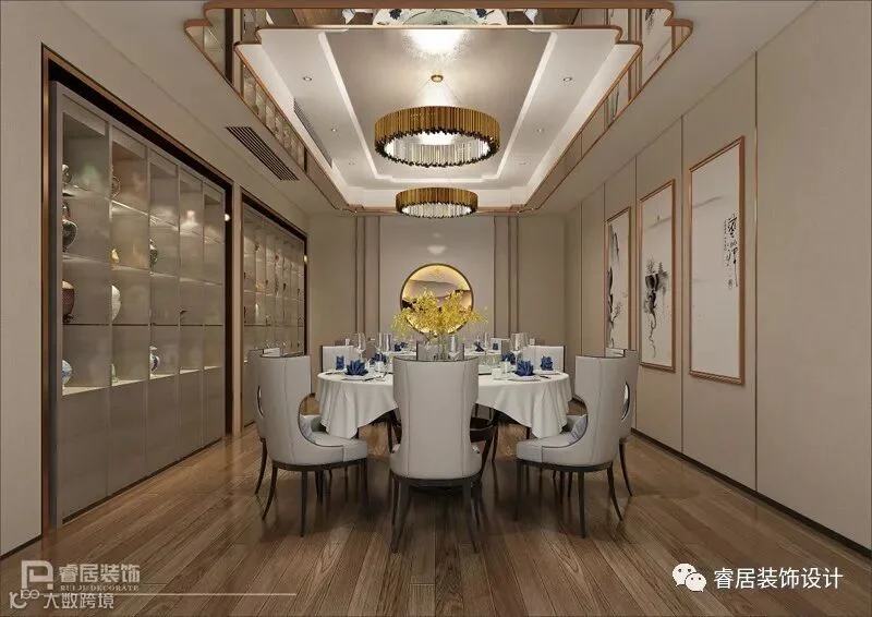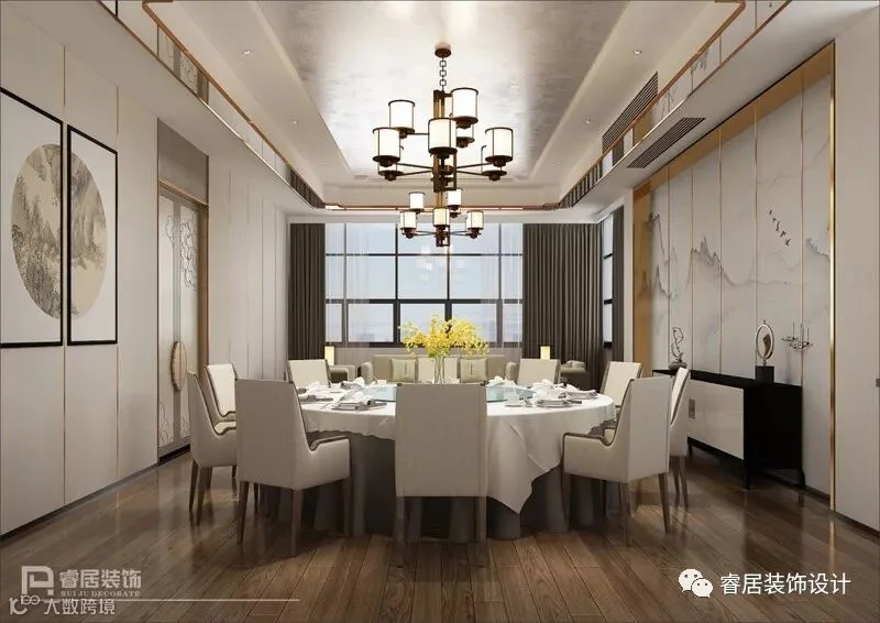 步入餐厅的大厅区,首先映入眼帘的是中国传统绘画与中式家具的结合,将中国的情感与人文修养一一道来。再经过设计师陈工及肖工的现代手法及工艺雕琢之后,尽显尊贵典雅、现代中式奢华。