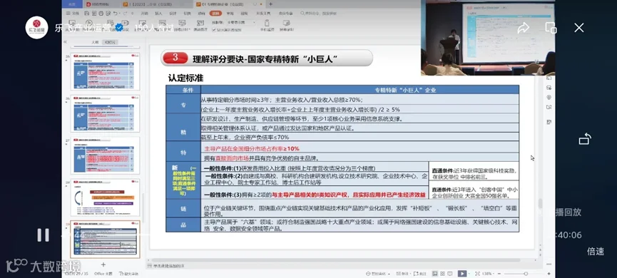 黄彩星老师首先从奖励政策、认定标准、评分要诀、防范问题四大板块展开了本次专精特新认定的宣讲。通过明确企业申报意义、分析认定条件,让企业家代表们对专精特新认定有清晰的认识,进而引导企业家代表们共同理解评分要诀,对创新型中小企业、省专精特新、国家专精特新“小巨人”等认定的评价指标和认定程序加以解析,提高参会企业代表对2023年专精特新企业认定相关政策的了解,最后指明需防范的问题,帮助企业提前发现问题、解决问题。
