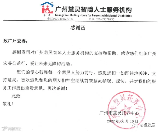 广州慧灵智障人士服务机构公益活动的感谢函