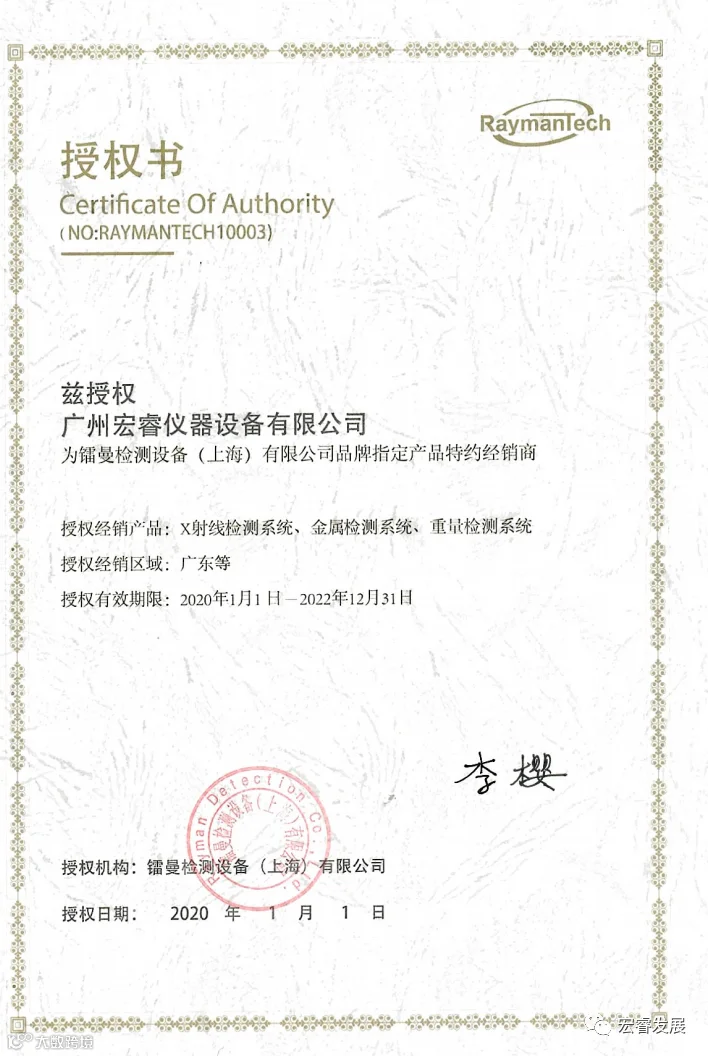 同时,我司设立的广州宏睿食品自动化检测设备技术应用中心配备X光机,金属探测器,动态秤,色选机以及部分实验室仪器,为广大客户提供设备租赁,产品测试和人员培训等技术服务。