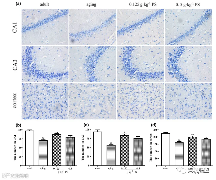 图 2 黄精对自然衰老大鼠神经元的改善(400X,n = 3)。(a)尼氏染色代表图;(b)海马CA1区神经元数量。##p < 0.0001老年组vs.成人组;**p = 0.0065 PS 0.125 g/kg组与老龄组比较。(c)海马CA3区神经元数量。##p = .0007老年组vs.成人组;*p = 0.0101 PS 0.125 g/kg组与老龄组比较。(d)皮层神经元数量。