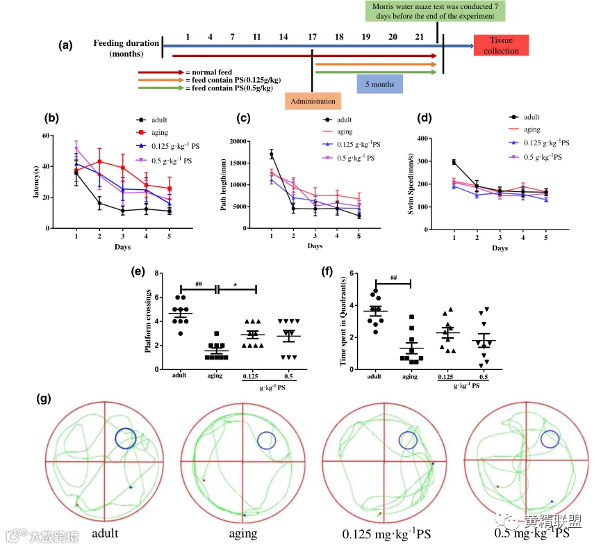 图 1黄精改善衰老大鼠空间学习和记忆障碍(n = 9)。(a)实验设计时间线。(b)第1 ~ 5天Morris水迷宫实验的逃避潜伏期。(c)第1天至第5天60s的总游泳距离。(d)第1 ~ 5天的平均游泳速度。(e)第6天在目标平台的穿越次数。##p < 0.0001老年组vs.成人组;*p = 0.0491 PS 0.125 g/kg组与老龄组比较。(f)第6天在目标平台象限的时间。##p = .0003老年组vs.成人组。(g)第6天的代表性轨迹:红色圆圈表示游泳总面积,右上角蓝色圆圈表示目标平台,红色点表示起始位置,蓝色点表示结束位置。