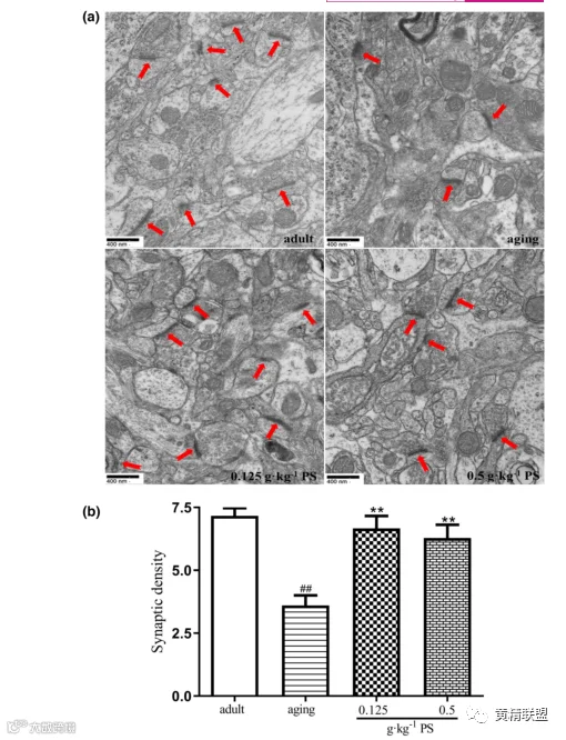 图 3 透射电镜观察黄精对衰老大鼠皮层中突触形态及数量变化的影响(40000X) (a)红色箭头表示突触;(b)皮质突触数量统计结果。使用图像J计算6个不同位置视图下的突触数量,并使用GraphPad prism 4.0对结果进行分析。数值以平均值±SD表示。##p < 0.0001老龄组vs。成年人组;**p = 0.0002 PS 0.125 g/kg组vs老龄组;**p = 0.0007 PS 0。5 g/kg组vs.老龄组。