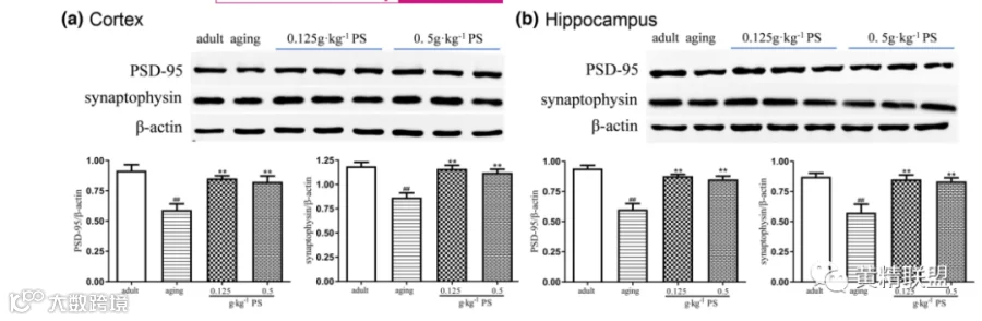 图 4 Western Blot 检测黄精对衰老大鼠皮层和海马中突触可塑性相关蛋白的影响 (n = 6)(a)皮层PSD- 95和synaptophysin的表达。(b)海马PSD- 95和synaptophysin的表达。数值(mean±SD;N = 6)与成年组相比,在##p < 0.01时认为显著;**与老龄组比较p < 0.01。