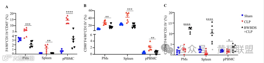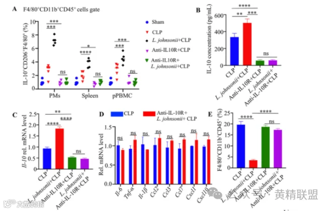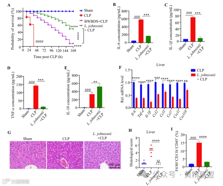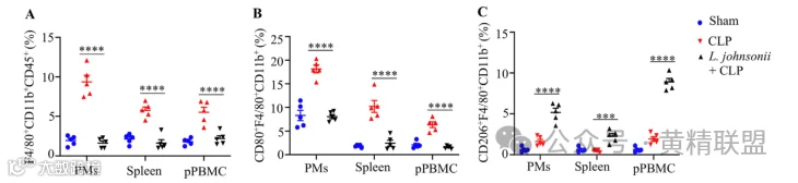 本实验还通过肠道菌群移植实验发现与CLP粪便接受小鼠相比,接受BWBDS粪便小鼠的存活率高(图4A);血清抗炎因子水平升高(图4B);肝脏中总巨噬细胞的数量减少(图4E);肠道微生物中约氏乳酸杆菌的丰富度增加(图4K和L)。进一步验证约氏乳酸杆菌是否为对败血症肝损伤反应的重要调节因子,比较了小鼠BWBDS治疗组和约氏乳杆菌治疗组多种指标。如与BWBDS治疗组相比,约氏乳杆菌治疗组生存率更高(图5A);血清中促炎因子水平显著降低,抗炎因子显著上调(图5B-F);肝脏中总巨噬细胞的比例降低(图5I)。这些结果表明,BWBDS缓解SILI的作用可能是通过增加约氏乳杆菌介导的。并且本实验还发现约氏乳杆菌治疗能逆转CLP诱导腹膜巨噬细胞(PMs)、脾脏和极化的外周血单核细胞(pPBMC)中总巨噬细胞的比例显著增加的现象(图6A);M1巨噬细胞减少,M2巨噬细胞增加(图6B和C)。这些结果表明,BWBDS治疗小鼠SILI可能与通过促进约氏乳杆菌生长来激活M2巨噬细胞,抑制M1巨噬细胞的功能来发挥作用。